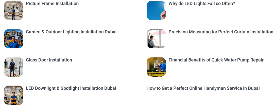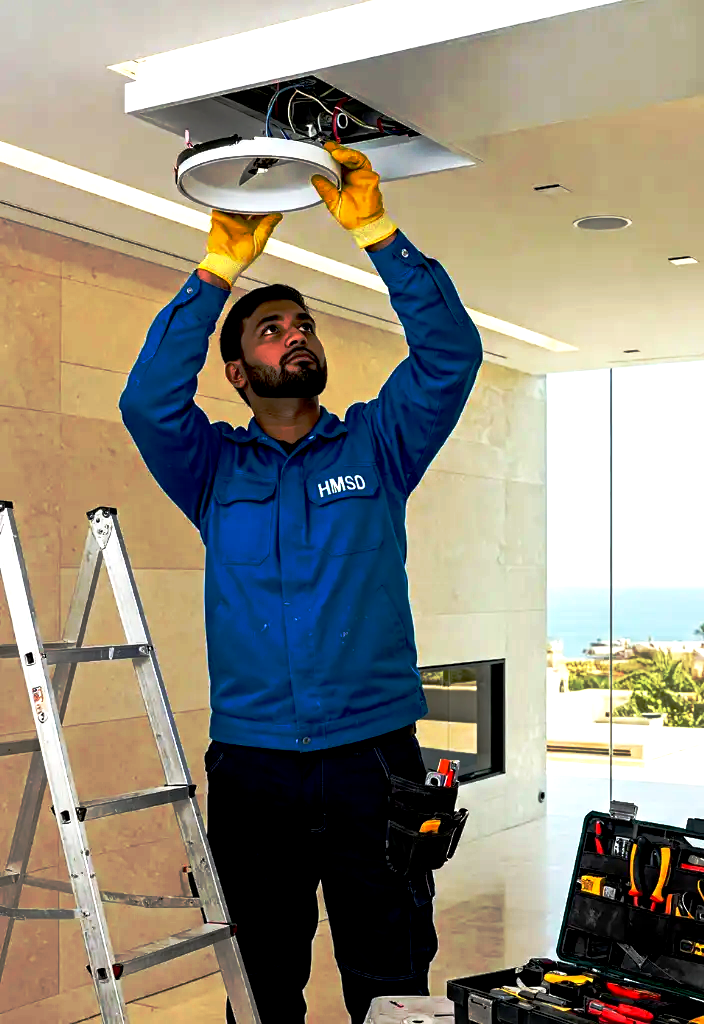 From ceiling light installation in Dubai apartments to fancy chandeliers in villas, our team expertly handles every lighting need. We install LED panels, pendant lamps, track lighting, and ceiling fixtures—safely and neatly. Whether your lights need drilling into concrete or false ceilings, we arrive fully equipped with ladders, anchors, and safety tools. Same-day LED light setup and lamp mounting are available for homes, retail stores, and salons.